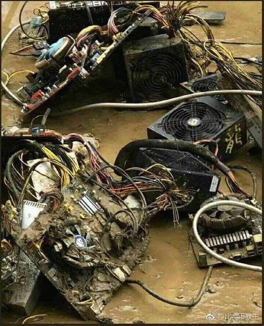 피해를 입은 채굴장 주위 사진을 보면 피해 규모를 짐작할 수 있다. 그래픽카드나 전용 ASIC(Application Specific Integrated Circuit) 등 채굴 장비가 공장 밖으로 실려 나와 있다. 이틀 동안 집중 호우를 받은 이 지역에선 공장 바로 옆에는 강물이 넘치고 토사로 인한 2차 재해 위험까지 있다고 한다. 밖으로 빼낸 장비는 모두 진흙투성이다. 메인보드나 전원공급장치 등에 물을 뿌려 진흙을 털어내고 있지만 다시 쓸 수 있을지 여부는 불투명하다.