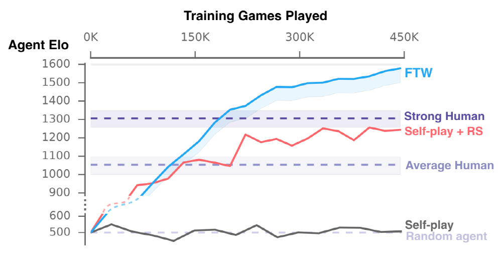 딥마인드 측은 인간 게이머 40명과 FTW 30개를 랜덤 매칭, 45만 회가 넘는 학습 과정을 거쳤다. 이 과정에서 신경망이 형성되고 게임 진행을 통한 동기 부여를 피드백, 수준을 끌어올렸다.