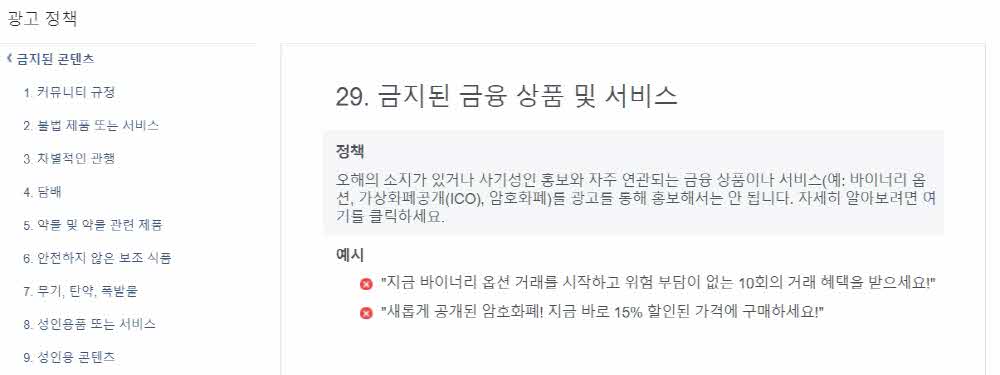 페이스북의 경우 지난 1월 페이스북 내에서 암호화폐를 포함한 금융 상품이나 서비스 광고를 금지하는 정책을 발표했다. 금융 상품과 서비스 금지(Prohibited Financial Products and Services)라는 정책을 통해 소비자가 오해하기 쉬운 금융 상품과 서비스를 조장하는 광고를 금지한 것이다. 이 같은 금융 상품과 서비스에는 ICO 암호화폐가 포함되어 있다. 페이스북 측은 새로운 정책을 공개한 이유에 대해 소비자가 사기를 당해 속을 우려를 하는 게 아니라 페이스북 광고를 보고 새로운 상품이나 서비스를 발견할 수 있기를 기대하기 때문이라고 밝히고 있다. 이런 점에선 ICO 암호화폐 광고를 하는 기업 대부분이 성실하게 운영되지 않고 있다는 지적이다. 페이스북 측은 또 이 같은 정책에도 모든 광고를 없앨 수는 없는 만큼 정책 위반 광고를 보면 신고를 하라고 밝히고 있다.