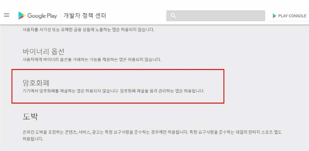 실제로 구글은 구글플레이 개발자 정책 센터에 암호화폐 항목을 추가하고 “기기에서 암호화폐를 채굴하는 앱은 허용되지 않습니다. 암호화폐 채굴을 원격 관리하는 앱은 허용됩니다”라고 밝히고 있다. 스마트폰 앱 생태계를 양분하고 있는 애플과 구글 등이 암호화폐에 대해 엄격한 규제를 가하는 상황인 것이다.