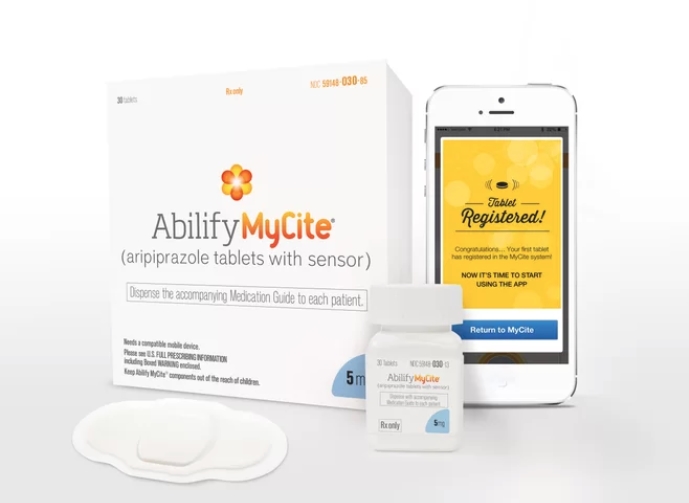 아빌리파이 마이사이트는 정신질환인 조현병 환자를 위한 약이다. 내부에는 구리와 마그네슘, 실리콘 같은 재질로 이뤄진 센서를 담았다. e-셀시우스는 소화가 안 되게 설계되어 있지만 아빌리파이 마이사이트는 위액에 접촉하면 블루투스 통신을 이용해 신호를 보낸 뒤 녹아 분해된다. 센서를 만든 소재는 모두 인체에는 무해하다. 이 제품이 신호를 보내면 웨어러블 패치를 통해 감지하게 된다. 패치가 인식한 정보는 다시 스마트폰 앱으로 전송되며 환자와 의사가 함께 공유할 수 있다. 이를 통해 정신질환에서 흔히 발생할 수 있는 약을 거부하는 환자의 투약 순응도 문제를 해결하려는 것이다.