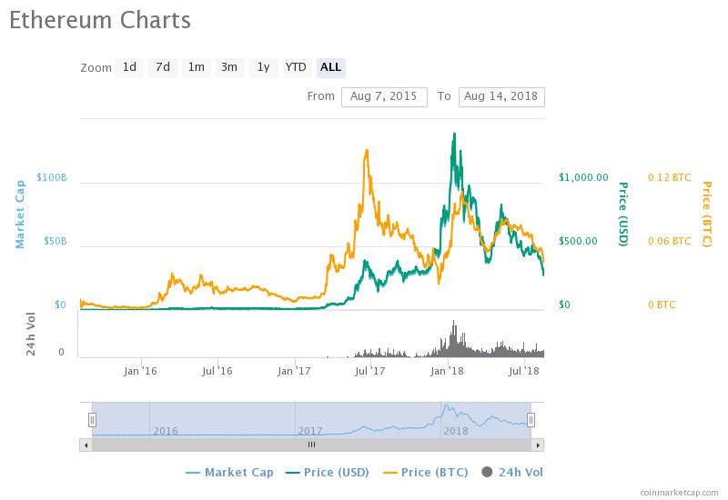 리플 뿐 아니라 앞서 밝혔듯 이더리움은 13일 300달러 이하로 떨어지면서 9개월 만에 최저치를 기록했다. 이더리움은 1주 동안 28%, 1개월 기준으론 33% 하락했고 300달러 이하로 떨어진 건 지난해 11월 이후 처음이다. 사상 최고치였던 1,337달러와 견주면 78%가 감소한 것.