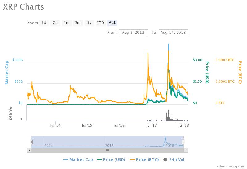 암호화폐 리플이 8월 14일 0.263624달러를 밑도는 등 올해 최저치를 기록했다. 1월 기록한 사상 최고치인 3.75달러와 견주면 92%나 하락한 것. 그 뿐 아니라 시가총액 2위를 달리고 있는 이더리움 역시 9개월 만에 최저치(270.24달러)를 나타내고 있다.