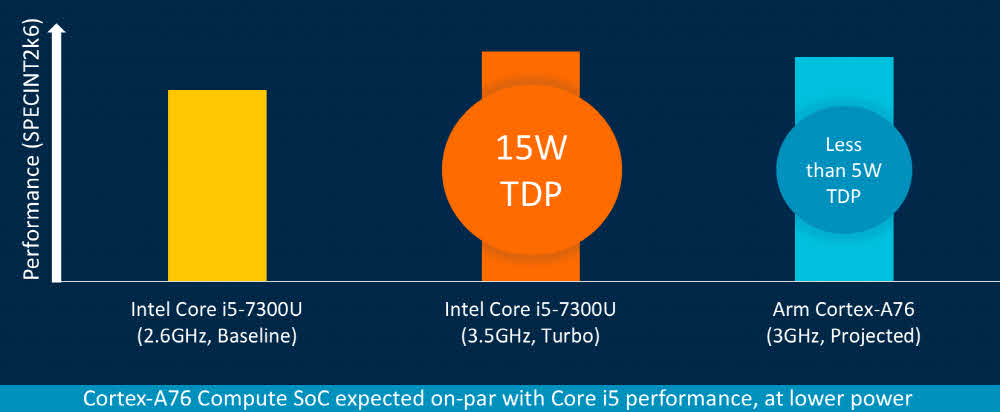 물론 ARM은 여기에서 최근 공개한 코어텍스-A76(Cortex-A76)이 3GHz 동작 클록에 TDP 5W 미만으로 15W 이상인 인텔 코어 i5-7300U 2.6GHz와 충분한 경쟁이 가능하다는 점을 말하고 있다.