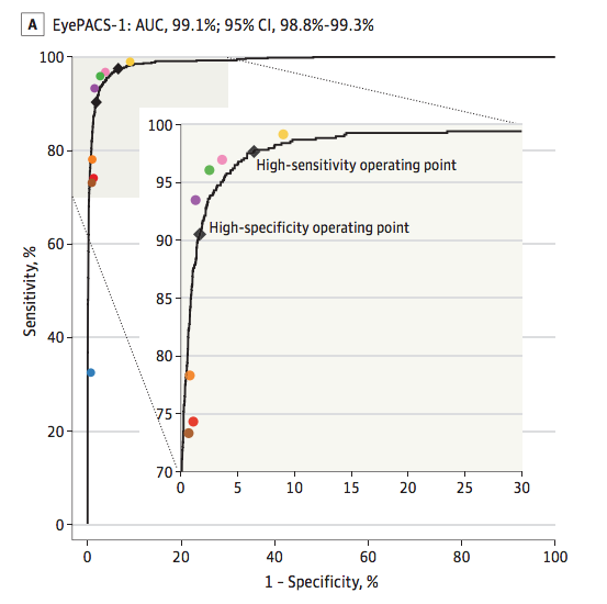 구글은 인도와 미국 안과 전문의 54명과 협력해 망막 이미지 12만 8,000장을 이용해 딥러닝을 통해 당뇨병 망막증을 감지하는 시도를 했고 이를 통해 당뇨병 망막증 9,963명을 발견했다. 결과에서 나타난 수치는 안과 전문의 8명보다 높았다고 한다. 물론 당시 구글이 실험한 건 당뇨병 망막증 발견에 국한된 것이고 이미지 인식 정확도 자체를 더 높이고 다른 검사 방법을 결합할 필요가 있었다.
