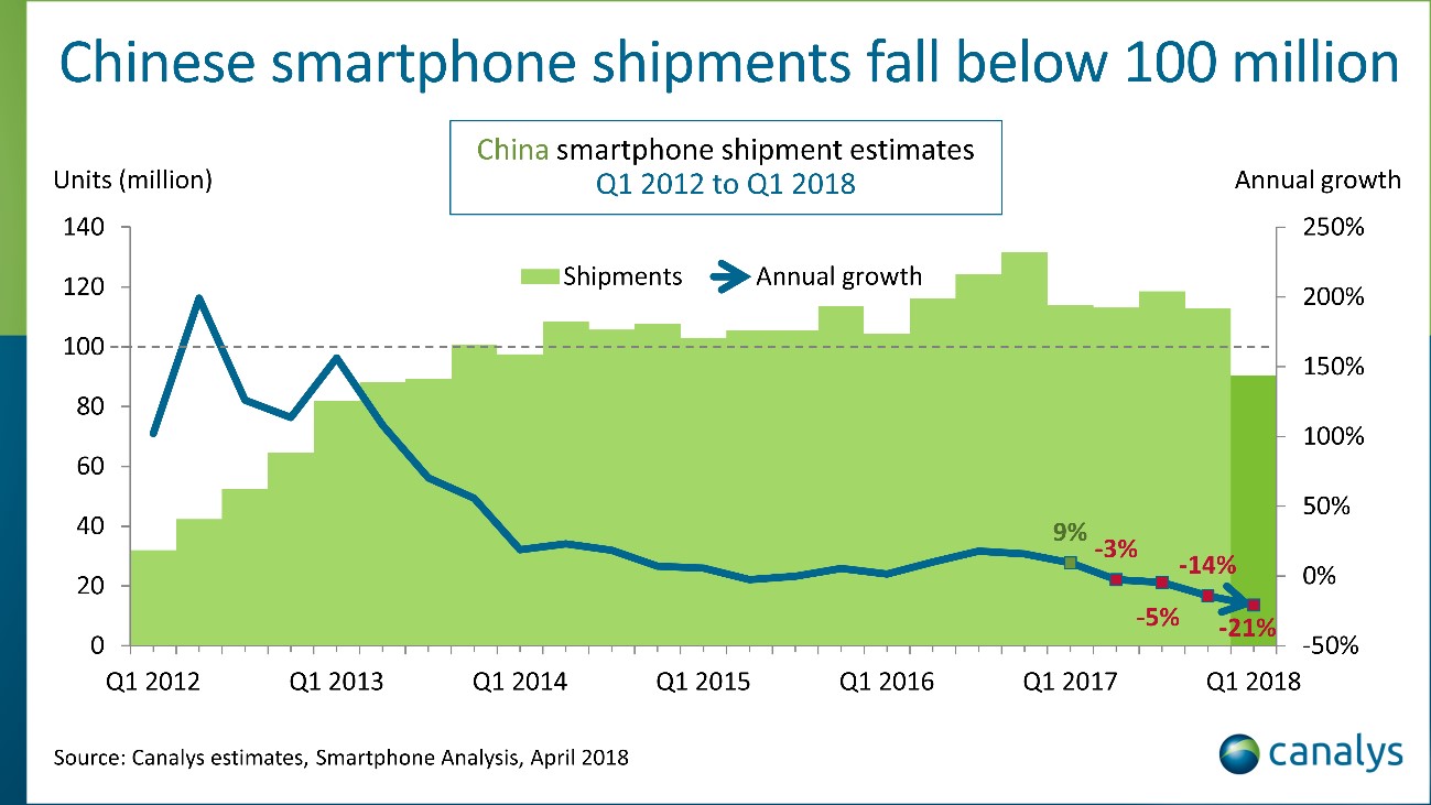 중국 내 스마트폰 판매가 감소세로 돌아서고 있다. 시장조사기관 카날리스(Canalys)에 따르면 올해 1분기 중국 스마트폰 판매 대수는 전년 동기대비 21% 떨어졌다. 지금까지 전 세계 스마트폰 시장을 견인해온 중국 시장이 정점에 오른 것 아니냐는 분석이다. 스마트폰 판매가 줄어드는 이유는 보급률이 높아지고 있다거나 혁신적인 기술 진보가 없는 등 다양한 원인이 지적된다.
