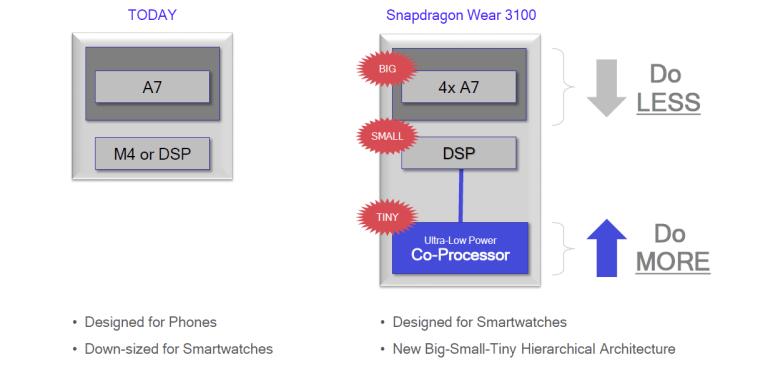 스냅드래곤 웨어 3100에 들어간 코프로세서인 QCC1110은 21mm2도 안 되는 초소형 크기다. 이 칩셋은 저전력 실현을 위해 최적화한 것이다. 키워드 검색 같은 사용자 정의 워크로드와 관련한 딥러닝 엔진도 통합하고 있다.