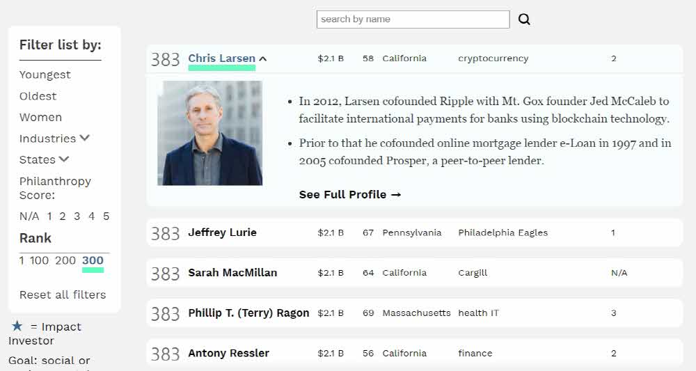 포브스가 10월 4일(현지시간) 미국에서 가장 부유한 400명을 평가해서 내놓은 포브스 400(Forbes 400) 2018년 버전을 발표했다. 눈길을 끄는 건 리플 공동 창업자인 크리스 라센(Chris Larsen)이 이름을 올렸다는 것. 암호화폐 업계 출신이 순위권에 이름을 올린 건 이번이 처음이다.