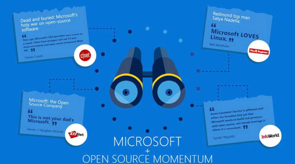 사티아 나델라 마이크로소프트 CEO는 블로그를 통해 개발자는 전 세계가 직면한 가장 어려운 문제를 해결하는 중심이라면서 소프트웨어 개발의 진정한 힘은 모든 개발자가 함께 협력하고 코드를 공유해 서로의 작품을 함께 만들어서 실현하는 것이라고 밝히고 있다. 이어 마이크로소프트가 창업 당시부터 지금까지 계속 개발자 퍼스트 기업이었다는 점을 들어 한 기술에 다른 사람의 기술이 더해져 지구상 모든 이들이 더 많은 걸 달성하는 걸 돕는 게 마이크로소프트의 핵심 미션이라고 밝혔다. 이 같은 그의 발언은 마이크로소프트의 오픈소스에 대한 생각을 말해준다고 할 수 있다.