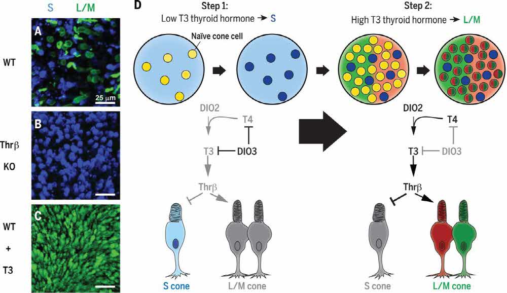 인간의 태아에서 가장 먼저 발달하는 건 청색을 인식하는 세포이며 그 다음은 적색과 녹색 인식 세포가 발달한다고 한다. 동물을 대상으로 한 연구에선 색상을 인식하는 원추세포 발달에는 갑상선 호르몬 기능이 관련이 있다고 한다. 연구팀은 시험관에서 발달하는 세포에 갑상선 호르몬을 주입하고 지켜봤는데 갑상선 호르몬 주입 상태에서 오가노이드는 적색과 녹색을 인식할 수 있는 침상체가 더 만들어졌다고 한다.
