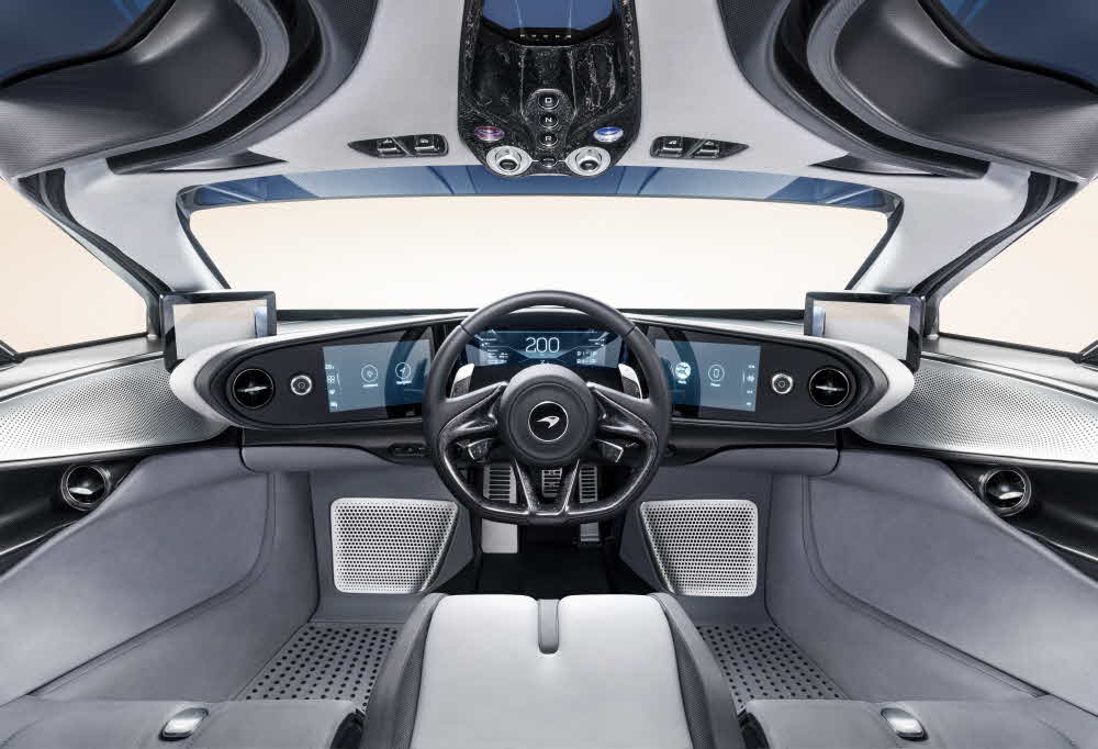 내부도 F1과 마찬가지로 조종석을 가운데에 배치하고 좌우 대각선 뒤쪽에 승객 시트를 배치했다. 대시보드는 3면 고해상도 디스플레이로 꾸몄고 가운데는 계기판처럼 운전 관련 정보, 좌우 터치 패널에는 카메라형 사이드 미러 영상 뿐 아니라 왼쪽 탐색이나 등화 장치 조작을, 오른쪽에는 인포테인먼트 시스템을 표시해준다. 또 시동 버튼이나 고속 주행용 벨로시티 모드를 선택하는 스위치 등 조작계는 항공기처럼 머리 위쪽에 배치했다.