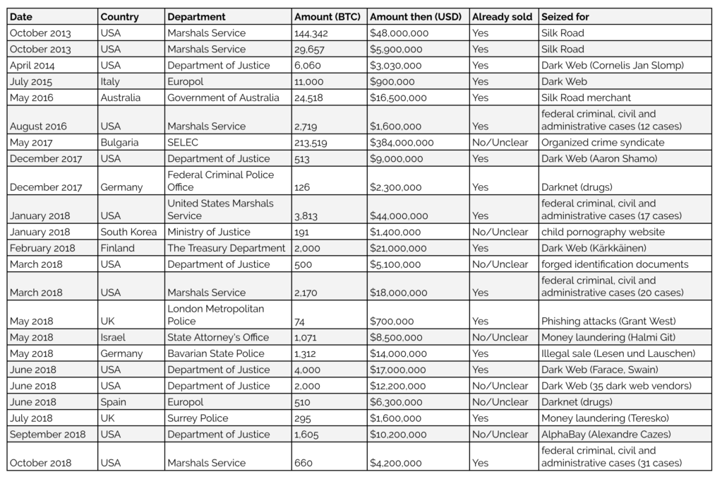이 같은 양은 전체 공급량 중 2.6%에 해당하는 것이다. 40BTC당 1개 비율로 정부가 소유하고 있는 셈이다. 전체 공급량 중 85.6%는 실크로드와 SELEC 사건을 통해 압수된 것이다. 미국 정부는 지난 2014년 비트코인 거래를 할 수 있는 사이트인 실크로드를 통한 압수 분량을 포함해 지금까지 19만 8,000BTC를 압수, 매각했다. 더블록 측은 미국 정부의 현재 보유액은 적어도 4,100BTC일 것으로 보고 있다. 미국 정부는 압수한 19만 8,000BTC 중 98%를 1억 5,100만 달러에 매각했는데 이는 1BTC당 780달러에 판매한 꼴이라고 한다.