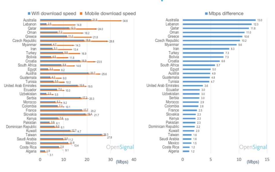 모바일 데이터 통신이 승리(?)한 33개국은 아프리카와 아시아, 유럽, 라틴아메리카 등 다양한 곳에 분포되어 있으며 별다른 공통점이나 편견 같은 건 없다고 한다. 예를 들어 호주에선 모바일 데이터 통신 하향 속도가 와이파이보다 13Mbps 빨라 큰 차이를 나타낸다. 그 밖에 레바논과 오만, 카타르, 그리스, 체코 등도 10Mbps 이상 차이로 모바일 데이터 통신이 와이파이보다 빠르다.
