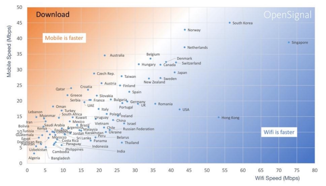 영국 모바일 서비스 평가 업체 오픈시그널(Open Signal)이 전 세계 80개국을 대상으로 조사한 결과 33개국에서 와이파이보다 모바일 데이터 통신 쪽 다운로드 속도가 빠른 것으로 나타났다고 한다.