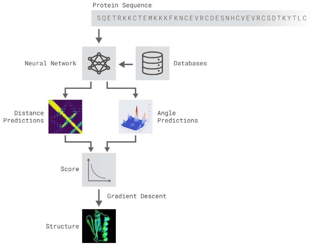 2가지 방법은 모두 유전자 배열에서 단백질 특성을 예측하도록 훈련한 신경망을 이용한다. 네트워크가 예측하는 특성은 아미노산 쌍의 거리와 그들을 연결하는 화학 결합 사이의 각도 2가지다. 이 2가지 예측에서 얼마나 정확한 단백질 구조를 제시할 수 있는지를 점수화하고 이 점수는 머신러닝을 이용해 기울기하강법(Gradient descent, steepest descent)에 최적화, 높은 정확도로 예측이 가능하게 됐다고 한다.
