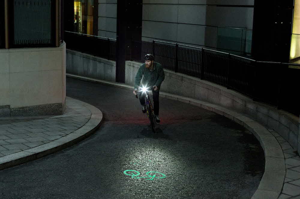 이 제품은 LED 좀녕에 녹색 레이저를 내장하고 있다. 자전거 핸드 부분에 장착해 이용하면 된다. 밝기는 400루멘. 여기에 6m 앞쪽 도로에 자전거 마크를 레이저로 표시해줘 자전거가 앞으로 올 것이라는 사실을 주위 자동차나 보행자에게 알려준다.