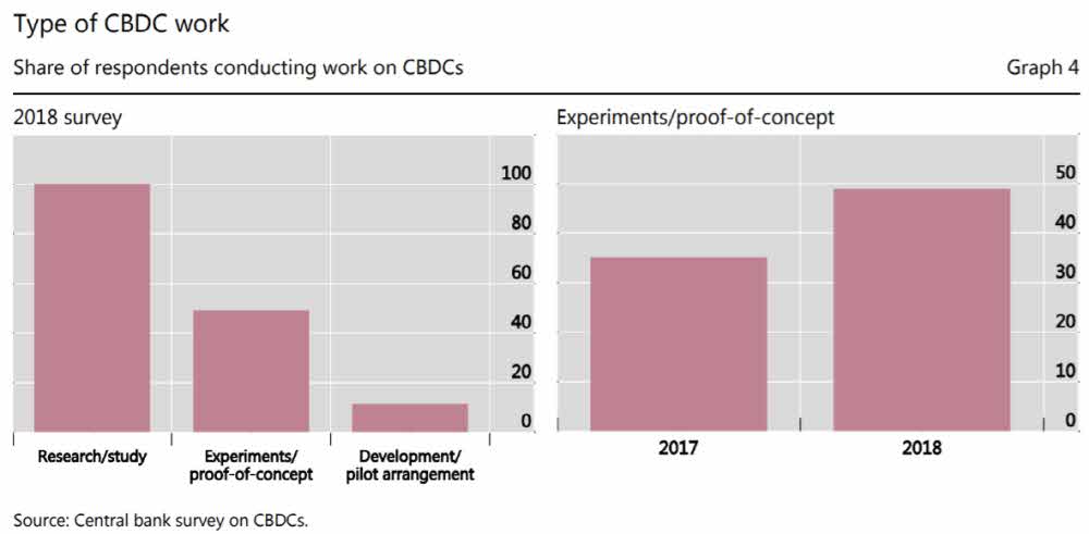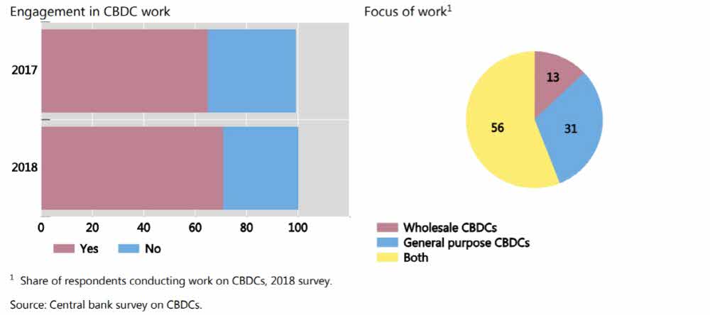 이에 따르면 63개 중앙은행 중 70%가 이론적인 CBDC에 대한 조사를 시작했거나 곧 시작할 방침이라고 한다. 지난 2017년 조사보다 조금 증가한 수치다. CBDC는 홀세일 그러니까 은행간 결제나 증권 결제에 대한 접근 제한을 둔 디지털 토큰이나 모든 사람이 쓸 수 있는 소매형 2가지로 크게 나눌 수 있다. 일반 소매형 CBDC는 BIS에 의해 일반 계좌를 기반으로 하거나 또는 범용 토큰이나 가치 기반형이라고 할 수 있다. 토큰형은 계좌 기반 소매형 CBDC처럼 일반인이 사용하지만 유통이나 송금 방법이 다르다.