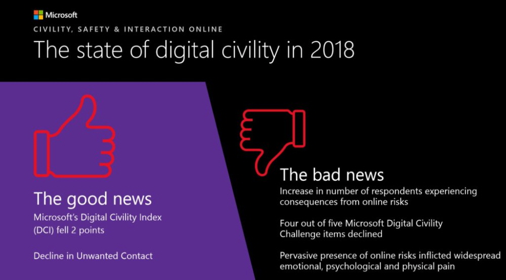 마이크로소프트는 이 같은 조사를 3년째 진행하고 있다. 수치상 큰 변화는 없지만 긍정적이라고 볼 수 있는 건 10대가 인터넷에서 문제에 직면하면 부모에게 도움을 요청하는 비율이 높아지고 있는 경향을 보인다는 것이다. 2017년 당시 도움을 요청한 층은 10%였지만 2018년 조사에선 42%까지 올라갔다고 한다. 관련 내용은 이곳에서 확인할 수 있다.
