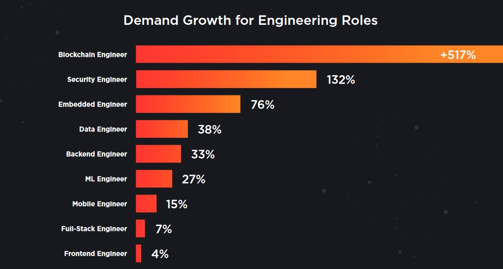 인재 기업인 하이어드(Hired)가 발표한 보고서(2019 State of Software Engineers)에 따르면 블록체인 엔지니어 수요는 전 세계적으로 확대되고 있으며 전년 대비 6.2배나 증가했다고 한다.