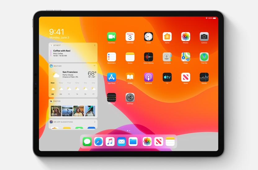 다음은 아이패드OS. 아이패드는 이제까지 iOS에서 작동했지만 이젠 전용 운영체제인 아이패드OS를 이용하게 된다. 홈 화면에는 위젯을 표시하고 앱 2개를 원본 문서와 나란히 보기나 분할 보기 외에 여러 앱을 나란히 열어 슬라이드 오버를 할 수도 있다.