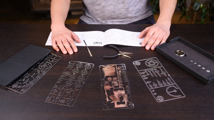 이 제품은 금속 재질로 만든 프라모델이라고 할 수 있다. 철판 1장에 부품을 붙인 여러 파트가 있고 이를 잘라 조립하는 것. 조립품에 따라선 태엽으로 움직일 수도 있다. 이를 통해 STEM 그러니까 과학, 기술, 공학, 수학 위주 교육에는 안성맞춤이라는 설명이다.