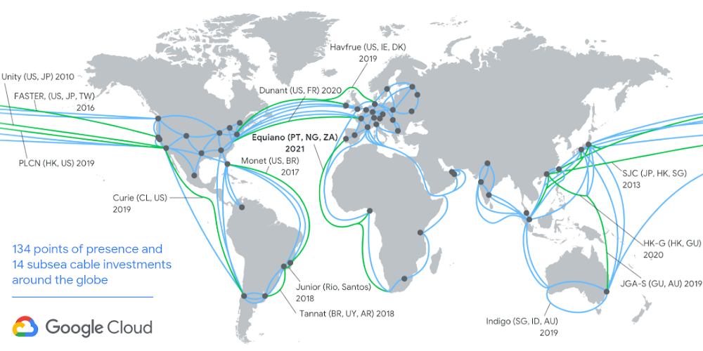 구글은 자체 인프라에 3년간 470억 달러를 쏟아 부었다. 자체 부담으로 부설한 첫 해저 케이블 큐리(Curie)를 4월 LA에서 칠레 간 연결했고 2번째인 뒤낭(Dunant)은 2020년 미국과 프랑스를 연결할 계획이다. 3번째인 에퀴아노는 구글에 따르면 기존 파장 레벨 스위칭이 아닌 광스위칭을 채택해 지금까지 나온 케이블보다 20배 속도를 갖게 될 것이라고 한다. 관련 내용은 이곳에서 확인할 수 있다.