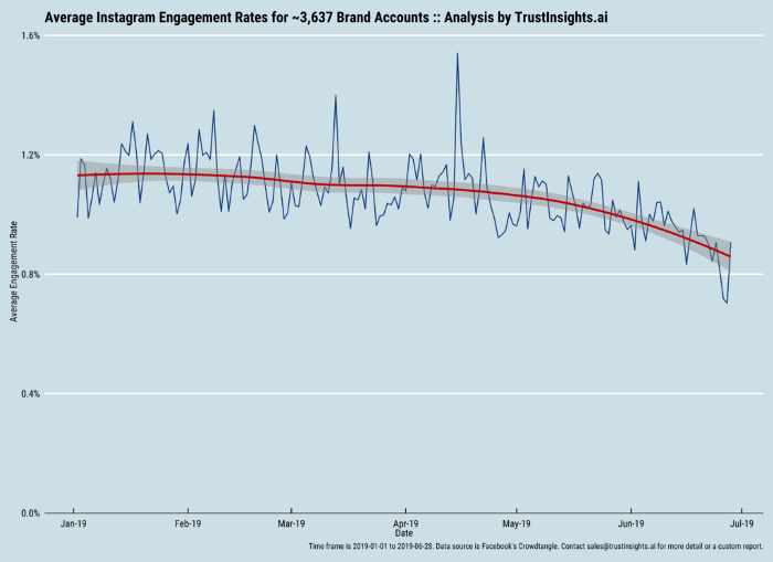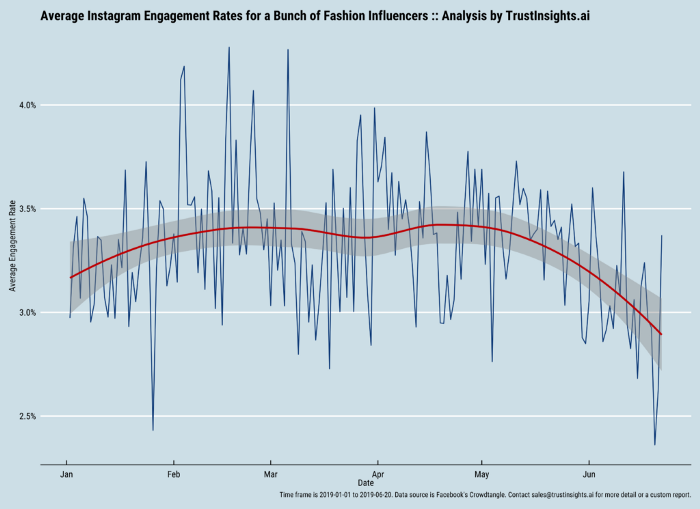 마케팅 기업인 트러스트인사이트가 발표한 보고서에서도 비슷한 감소 추세가 나타난다. 예를 들어 패션 업계에선 인스타그램 인플루언서의 평균 참여 비율은 그래프로 시각화하면 5월 경부터 뚝뚝 떨어지기 시작한다.