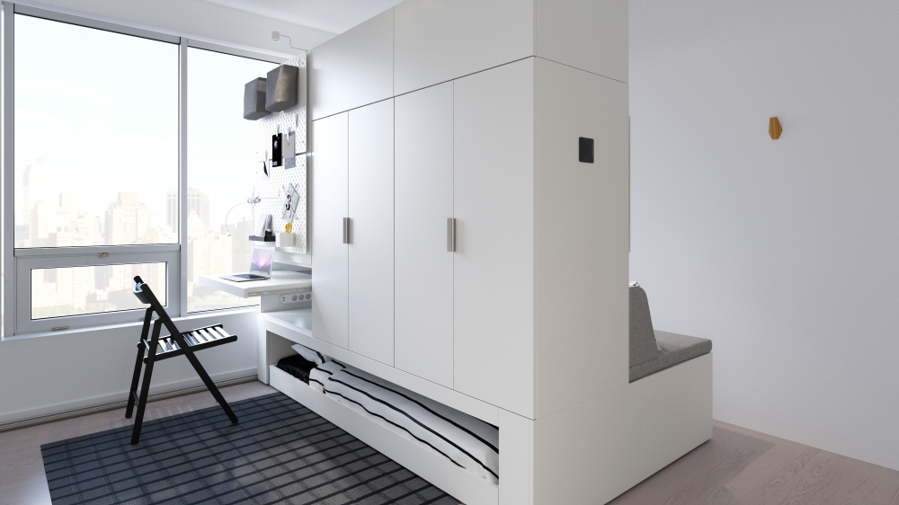 이 제품은 어린이용 가구로 한때 인기를 끌었던 책상과 옷장 일체형으로 이뤄진 침대처럼 보인다. 하지만 가장 큰 차이는 큰 본체를 스위치 조작으로 이동시킬 수 있다는 것이다. 활동에 따라 거실 쪽이나 침대 쪽을 넓게 조절할 수 있는 것.