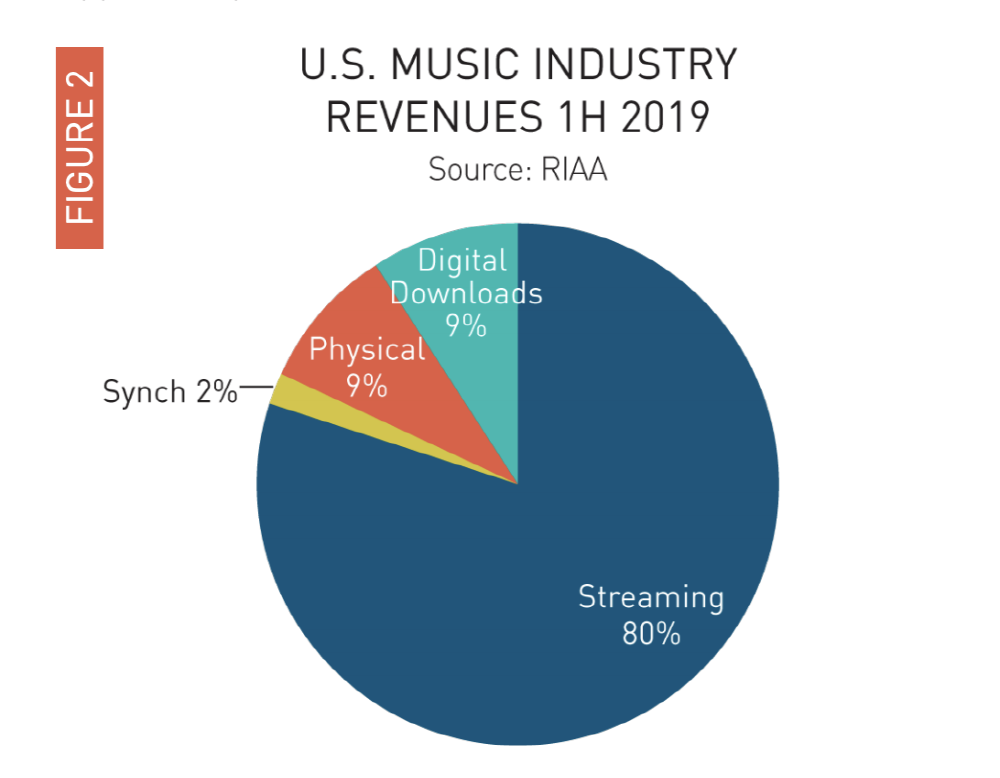 미국 레코드 협회 RIAA(Recording Industry Association of America)가 최근 발표한 보고서에 따르면 2019년 상반기 음악 산업 총 매출액은 18% 늘어난 54억 달러이며 이 중 80%는 스트리밍에 의한 것이었다고 한다. 또 미국 내 유료 가입자 수가 처음으로 6,000만 명을 넘어섰다고 한다. 동기화 스트리밍 매출은 26% 늘어난 43억 달러였다.