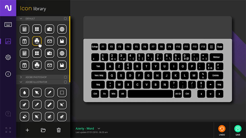 사용자는 전용 앱을 통해 원하는 문자로 바꿀 수 있다. 일반적인 쿼티(QWERTY)는 물론 프랑스식(AZERTY), 스페인어와 중국어 등 원하는 대로 배열이나 언어를 볼 수 있다. 앱에선 원하는 아이콘을 드래그앤드롭 형태로 간단하게 바꿀 수 있다. 그 뿐 아니라 사용하는 소프트웨어에 따라 표시 내용을 바꿀 수도 있다. 외부 연동은 블루투스를 이용하기 때문에 윈도와 맥 외에 스마트폰이나 TV, 프로젝터 등 모든 장치와 연결할 수 있다.