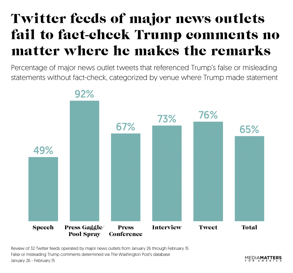 트위터에서 트럼프 미국 대통령이 어설픈 인식에 근거한 발언을 하면 순식간에 전세계로 확산된다. 비영리조직인 미디어매터포아메리카(Media Matters for America) 조사에 따르면 트럼프 대통령의 트윗에 관한 주요 뉴스 제공자 보도 중 30%는 잘못된 정보를 포함하고 있었다고 한다. 또 65% 확률로 언론은 이를 정정하거나 왜 그런 일이 있었는지 설명하지 못했다고 한다.
