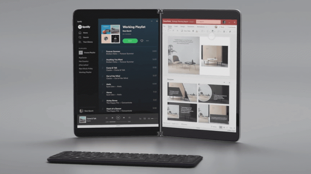 디스플레이는 단면 9인치, 양쪽으로 펼치면 13인치 상당 크기다. 좌우 디스플레이에서 서로 다른 앱을 실행할 수 있는 건 물론. 운영체제인 윈도10X(Windows 10X)는 32비트 버전 윈도 응용 프로그램을 지원할 예정이라고 한다.