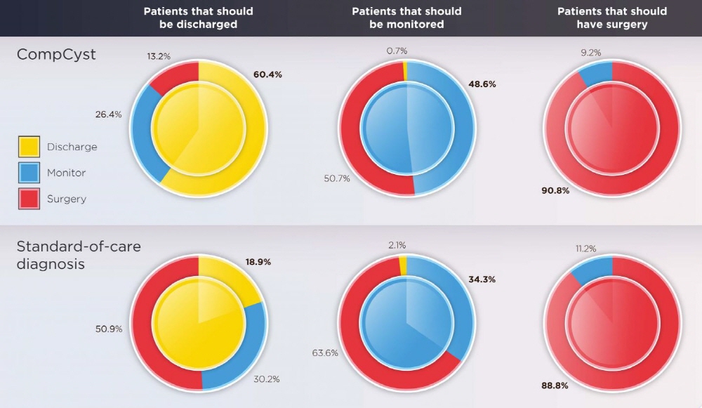 존스홉킨스대학 시드니 종합 암센터 연구팀은 췌장 낭성 질환 수술을 받은 환자 436명 데이터를 수집해 컴프시스트(CompCyst)라는 AI를 통해 훈련시켰다. 이후 컴프시스트에게 또 다른 췌장 낭성 질환 환자 426명을 대상으로 양성이니 퇴원시켜라, 경과 관찰이 필요하다, 수술이 필요하다 3단계로 분류하도록 했다.