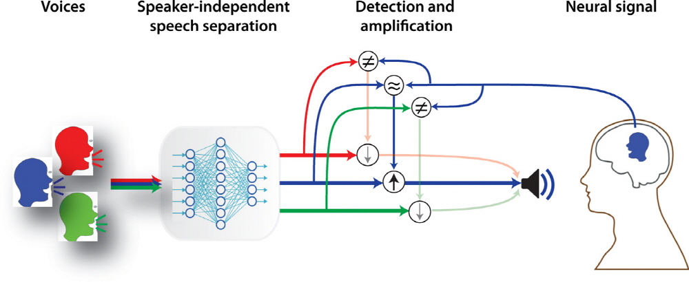 이에 따라 연구팀은 기술을 이용해 음성 소리를 증폭해주는 새로운 마이크 디자인을 연구한다. 신경망이 음성처리 알고리즘을 통해 모든 소리를 포착한 뒤 개별 오디오 스트림으로 분리한다. 청취자의 뇌파와 비교해 뇌 활동에 가장 가까운 소리를 자동으로 증폭하는데 가장 식별하기 쉬워진다는 구조다.