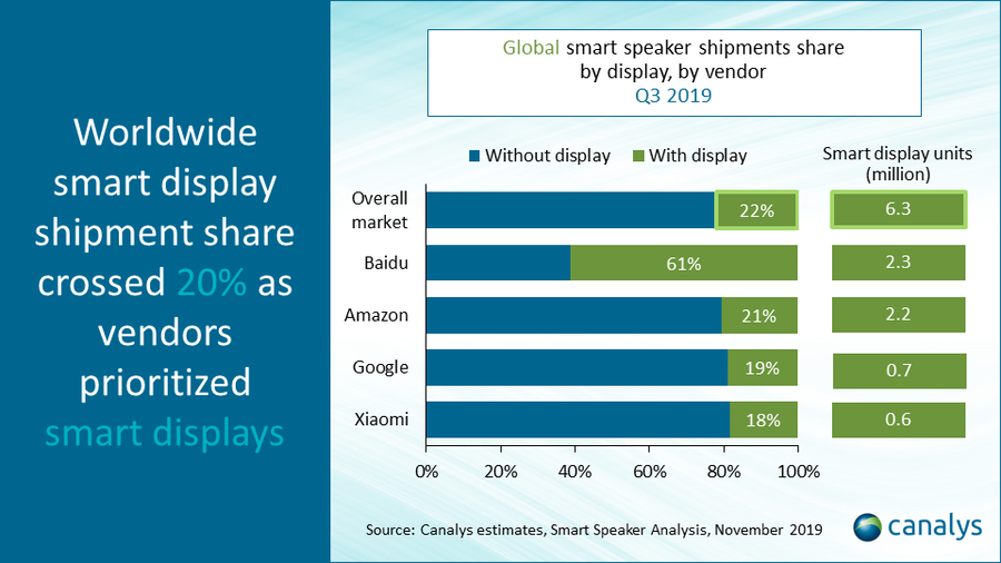 시장조사기관 카날리스 보고서에 따르면 2019년 3분기 구글의 스마트 스피커 출하량은 350만대로 전 세계 4위를 기록했다. 2분기에는 중국 바이두에 밀려 2위에서 3위로 추락했지만 순위가 한 단계 더 내려간 것. 전년 동기와 비교하면 판매량은 40%나 줄었다.