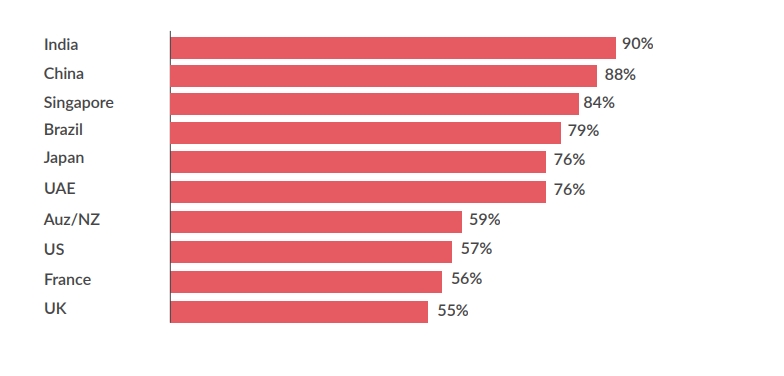 국가별로 보면 인도가 78%로 가장 높고 중국 77%, 아랍에미리트연합 62% 순이다. 또 AI 동료가 직장에 있다는 걸 기쁘게 생각한다고 응답한 비율도 인도가 60%로 가장 높았고 중국 56%, 아랍에미리트 44% 순을 나타냈다. AI와 일을 환영하는 국가에선 이미 AI가 도입되고 있을 가능성이 높다는 걸 보여준다.
