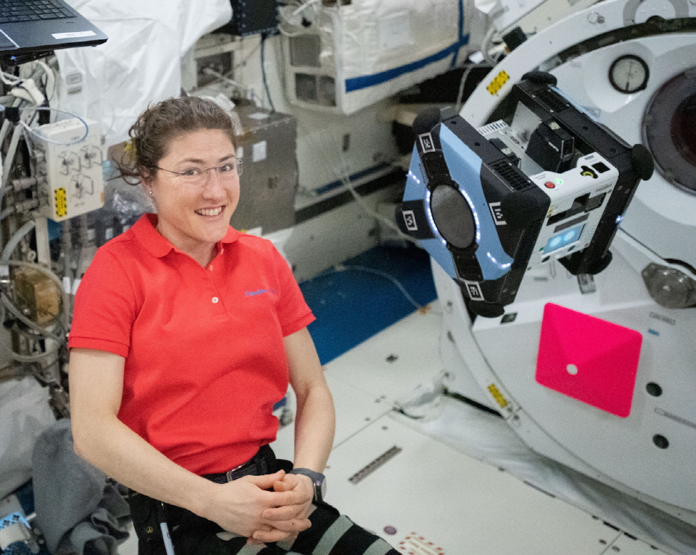 이번에는 사각형 로봇인 아스트로비(Astrobee)가 우주비행사인 크리스티나 쿡을 상대로 실험을 진행하고 있다. 이 로봇은 ISS 내부를 자율 운전하면서 이동하는 승무원을 지원하는 역할을 맡고 있다.