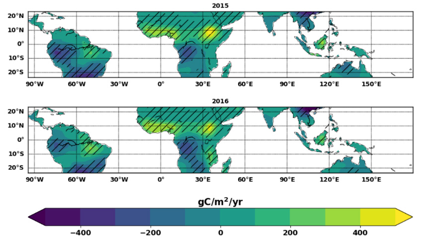 이에 따르면 아마존 강 유역 열대우림을 보유한 남미와 호주 북부 대부분은 이산화탄소를 대량 흡수하고 있다는 걸 알 수 있다. 아프리카 역시 콩고분지를 중심으로 한 남부 지역은 비슷하다. 하지만 아프리카 서부와 에티오피아가 위치한 지역은 상당량 이산화탄소가 방출되고 있다고 한다.