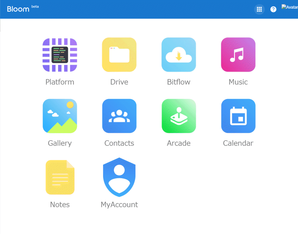 블룸은 클라우드 서비스인 플랫폼(Platform), 클라우드 스토리지인 드라이브(Drive), 인터넷에서 파일을 직접 내려 받게 해주는 비트플로우(Bitflow), 드라이브 음악 데이터를 재생할 수 있는 뮤직(Music), 드라이브 내 사진과 동영상을 관리, 공유할 수 있는 도구인 갤러리(Gallery), 연락처를 관리할 수 있는 컨택(Contacts), 게임을 즐길 수 있는 아케이드(Arcade), 이벤트 관리를 할 수 있는 캘린더 서비스인 캘린더(Calendar), 텍스트 메모를 적을 수 있는 노트(Notes), 자신의 계정 정보를 관리할 수 있는 마이어카운트(MyAccount)까지 10가지 도구를 제공한다.