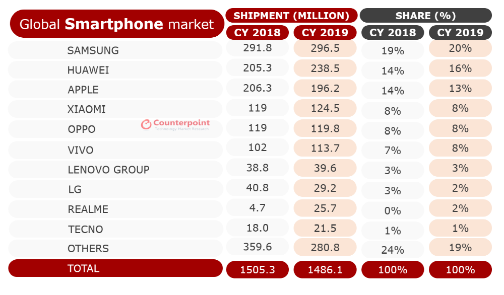 시장조사기관 카날리시스와 카운터포인트리서치가 2019년 전 세계 스마트폰 시장 점유율 보고서를 발표했다. 양사 모두 화웨이가 큰 성장을 이뤘다고 밝히면서 화웨이가 애플을 넘어 전 세계 2위 점유율을 보유한 스마트폰 업체 지위로 올라선 것으로 나타났다.