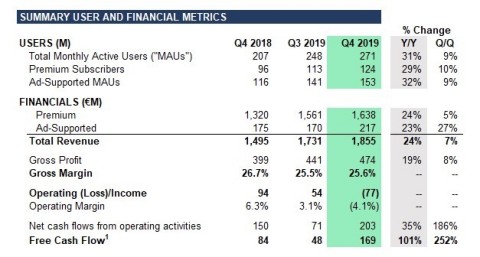 스포티파이(Spotify)가 2019년 4분기 실적 발표에서 사상 최대 매출을 올려 전체 가입자수가 1,000만 명 늘어난 2억 7,100만 명을 기록했고 유료 사용자 수만 따져도 1억 2,400만 명에 달했다고 발표했다.