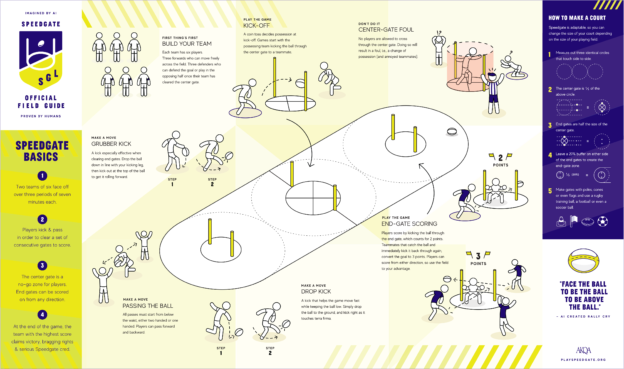 스피드게이트 웹사이트를 방문하면 세세한 규칙을 볼 수 있다. AKQA 측은 오레곤 스포츠 협회와 스피드게이트에 대해 얘기를 나누고 있으면 여름 무렵에는 지역 리그를 설립할 가능성도 있다고 한다. AKQA는 기존 400종류에 달하는 스포츠 정보를 신경망에 넣고 스피드게이트를 만들었다고 한다. 럭비나 축구, 농구 등을 섞어 혼합한 것 같은 스포츠가 탄생한 것이다.