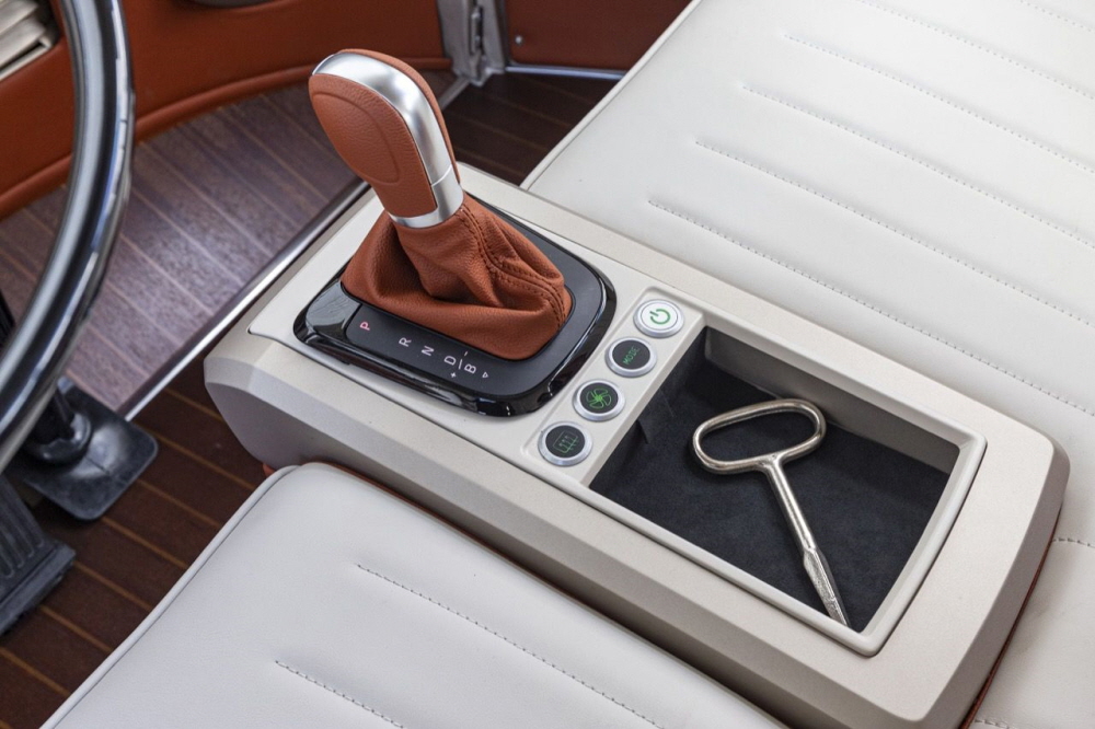 외장에 따라 투톤 가죽을 입힌 인테리어에선 원래 긴 수동 변속 레버를 빼고 운전석과 조수석 사리에 현대적인 자동 변속기를 배치했다. 시프트 포지션으로 친숙한 P, R, N, D 뿐 아니라 회생 브레이크 효과를 수동으로 바꿀 수 있는 B도 배치했다. 엔진 시동도 전기 시스템 부팅 버튼을 이용한다.