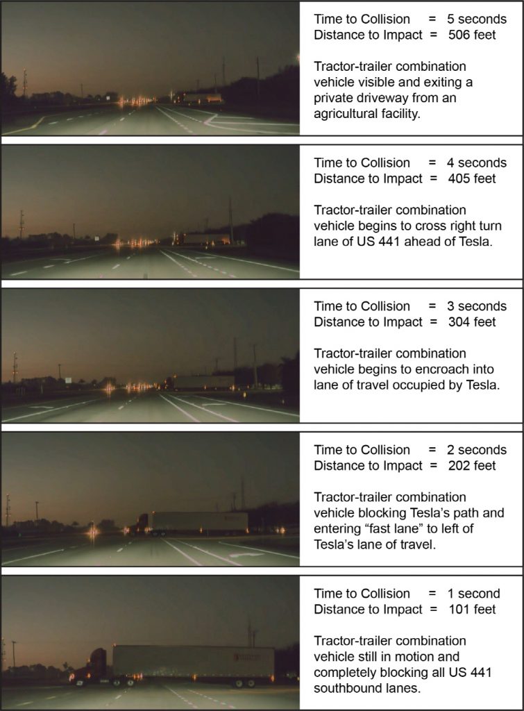 사고를 낸 모델3가 탑재한 오토파일럿 기능은 이 지역 34번 고속도로를 횡단하는 도로가 고속도로 본선 통행을 방해하는 경우를 상정하지 않았다. 오토파일럿을 사용 중인 운전자에게 전방을 주시하라는 기능이 있었다면 눈앞을 가로지르는 트레일러 존재를 발견하고 사고를 피할 수 있었을 가능성이 높았다고 볼 수 있다.