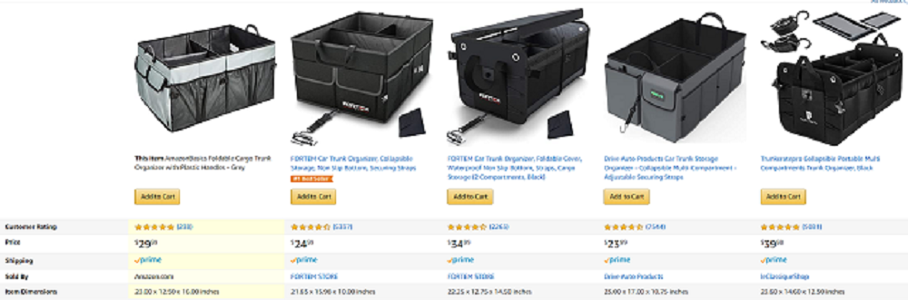 이미지 속에 나오는 것도 2019년 10월 출시한 아마존 베이직 상품. 유사품 비교 차트로 확인해보면 경쟁 제품(Fortem, DRIVE, Trunkcratepro)보다 아마존 베이직이 먼저 표시된다. 참고로 경쟁 제품 리뷰 수는 각각 5,337건, 7,544건, 5,081건인데 비해 아마존 베이직 해당 모델은 238건이다. 결국 이런 것도 자사 브랜드에 유리하도록 알고리즘을 조작하고 있다는 비판으로 이어질 수 있다.