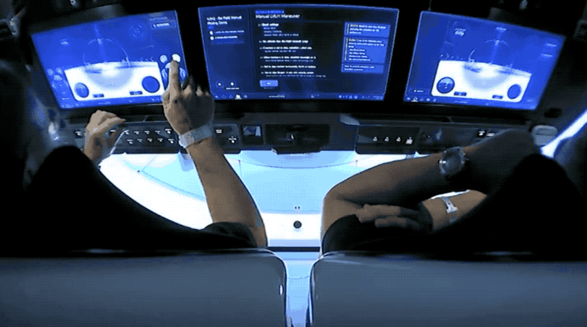 수동 조종은 터치스크린을 통해 캡슐에 LVLH 그러니까 기내에서 수직 수평 작업을 하는 것도 포함하고 있다. 이 경우 고도는 지표로부터의 거리다. 다시 말해 크루드래곤 조종은 현재 항공기 조종에 상당히 가깝다는 얘기다. 우주비행사가 직접 조종 작업을 수행하는 동안에는 자동 시스템이 작동을 대체할 수 없게 컴퓨터에 명령을 보냈다. 도킹을 포함한 미션 전체를 제어하는 컴퓨터 시스템을 비활성화하고 실제 크루드래곤을 이동시키는 지령은 보내지 않았다.