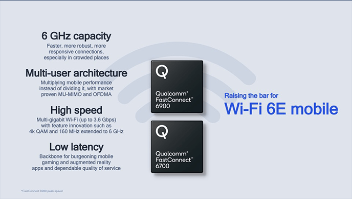 퀄컴이 지난 5월 28일(현지시간) 모바일 통신칩인 패스트커넥트(FastConnect) 6900과 6700을 발표했다. 이들 칩은 지난 1월 책정된 새로운 규격인 와이파이6E(Wi-Fi 6E)를 지원해 지금까지 나온 와이파이보다 훨씬 빠른 통신이 가능하며 최신 블루투스 5.2도 지원한다.