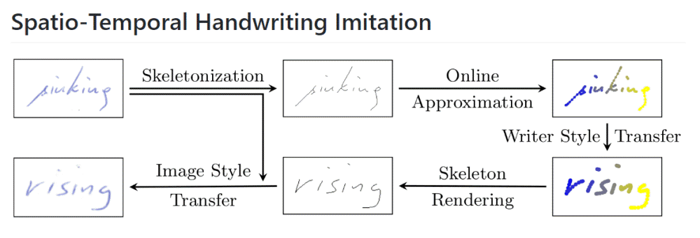 연구팀이 개발 중인 시스템은 왼쪽 프레임에 쓰인 필기 단어를 먼저 세선화(Skeletonization), 온라인 시퀀스를 통해 단순화한다. 그런 다음 쓰는 스타일이 미리 입력되어 있는 문자열에 적용한다. 이를 렌더링한 뒤 필기가 이미지로 출력되는 것. 이 방법은 사람의 손으로 쓰인 한 단어를 입력하면 다른 문자로 쓰는 사람 특유의 문자를 출력해줄 수 있다.
