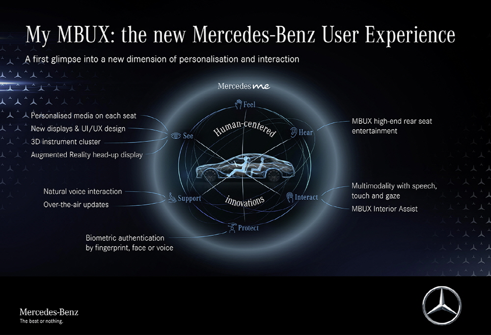 새로운 MBUX는 오디오 조작은 물론 시트 조정, 차내 조명 조광 등 편의 기능 외에 개인 프로필을 저장하며 똑같은 새로운 MBUX를 보유한 다른 차량에 설정을 승계해 이용할 수도 있다.