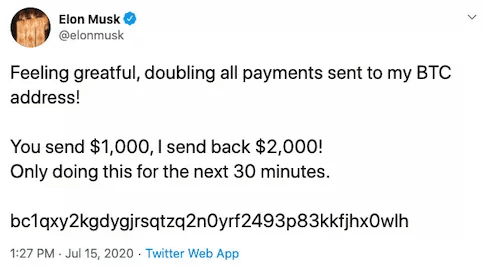 엘론 머스크의 계정에 올라간 첫 번째 비트코인 사기 관련 트윗에는 앞으로 1시간 안에 자신의 비트코인 주소로 송금된 돈을 2배로 되돌려줄 것이라는 내용을 담았다. 해당 트윗이 삭제된 뒤 그의 트위터 계정에는 앞으로 30분간 자신의 비트코인 주소로 보내면 2배로 주겠다며 당신이 1,000달러어치 비트코인을 보내면 자신은 2,000달러어치 비트코인을 줄 것이라고 올라갔다. 그의 트윗에는 비트코인 주소가 적혀 있고 비트코인 주소는 엘론 머스크 외에 해킹된 게정도 포함되어 있다.